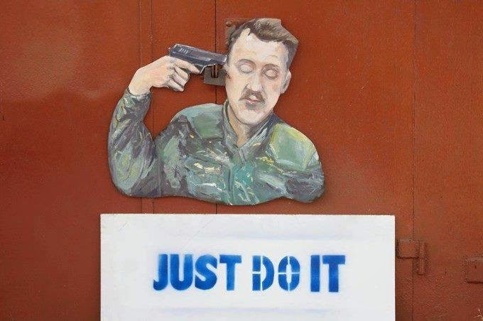 Ukrainian flag on the city council), and should be hunted down. The courageous local artist